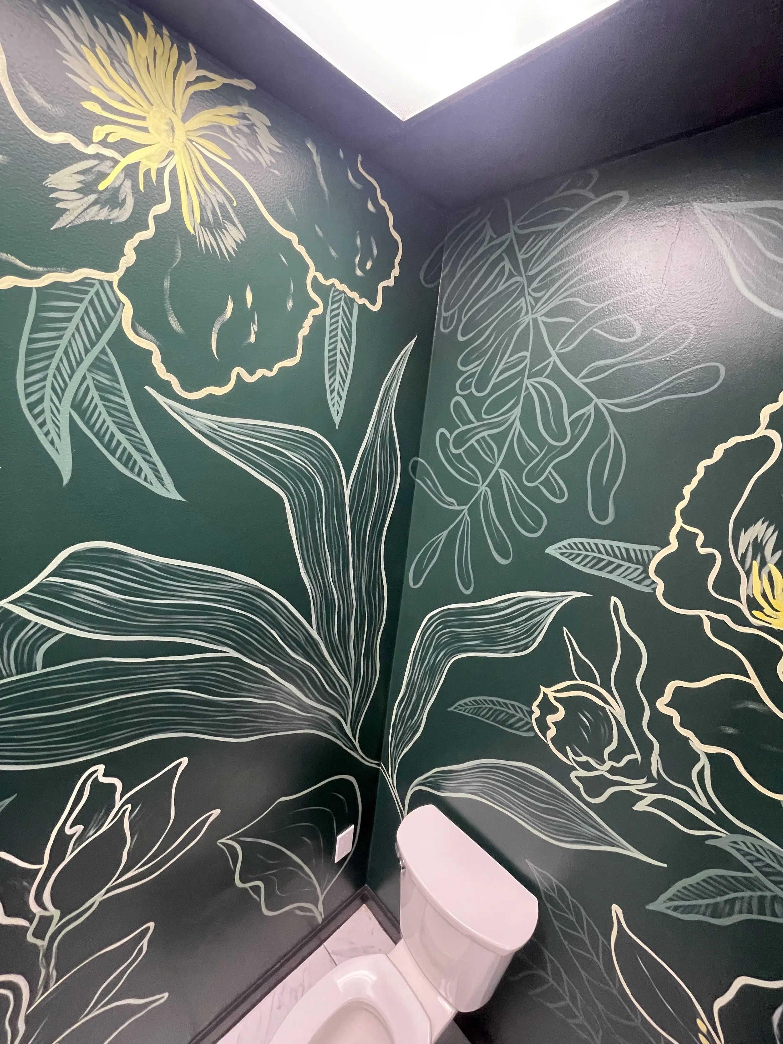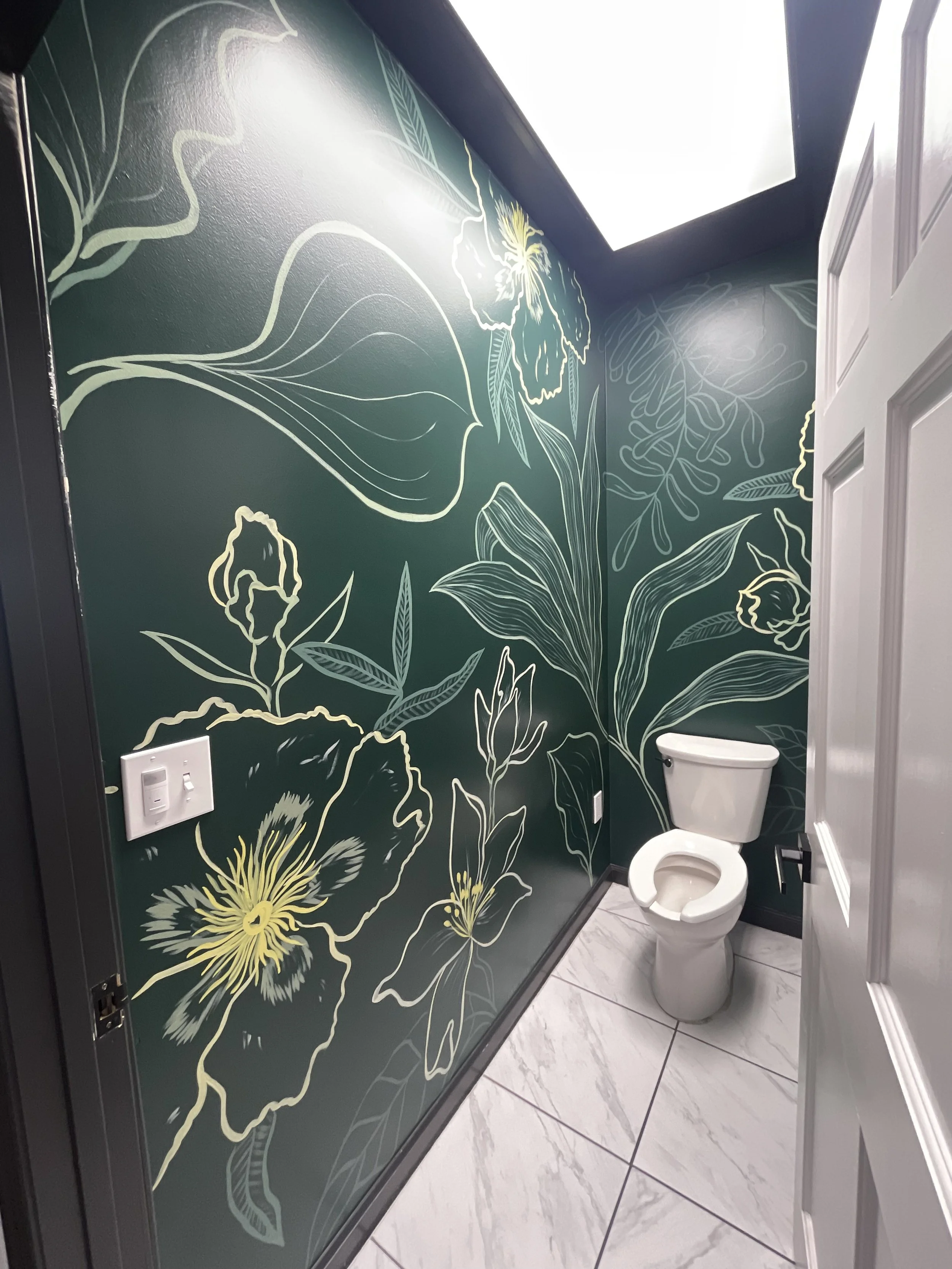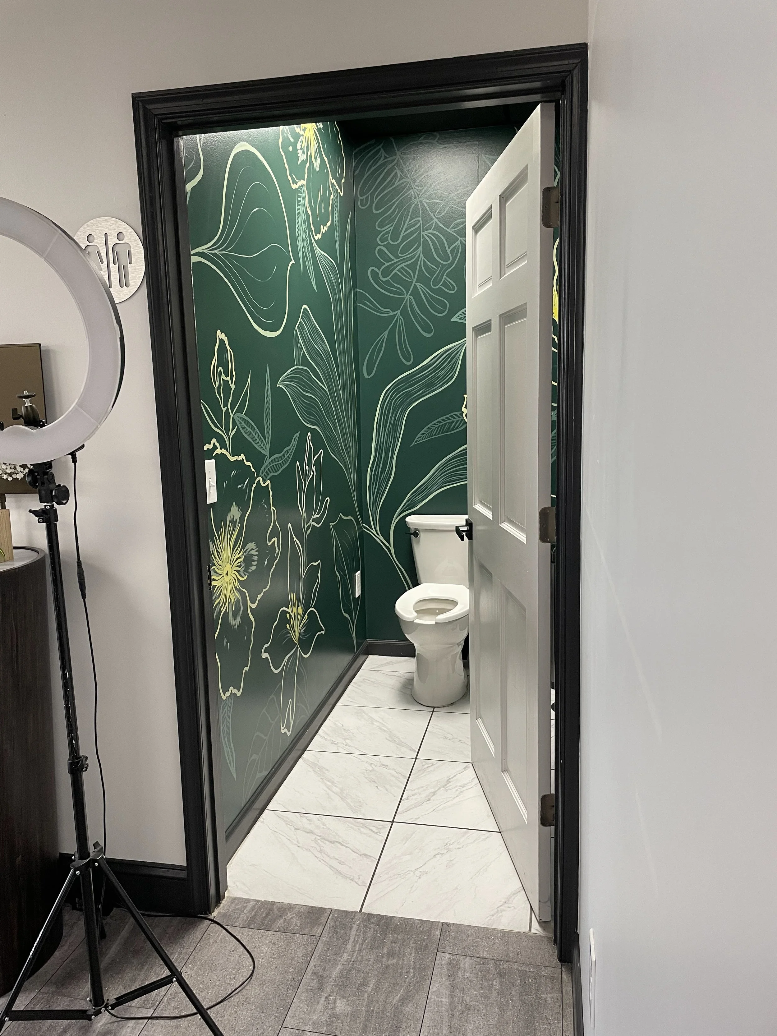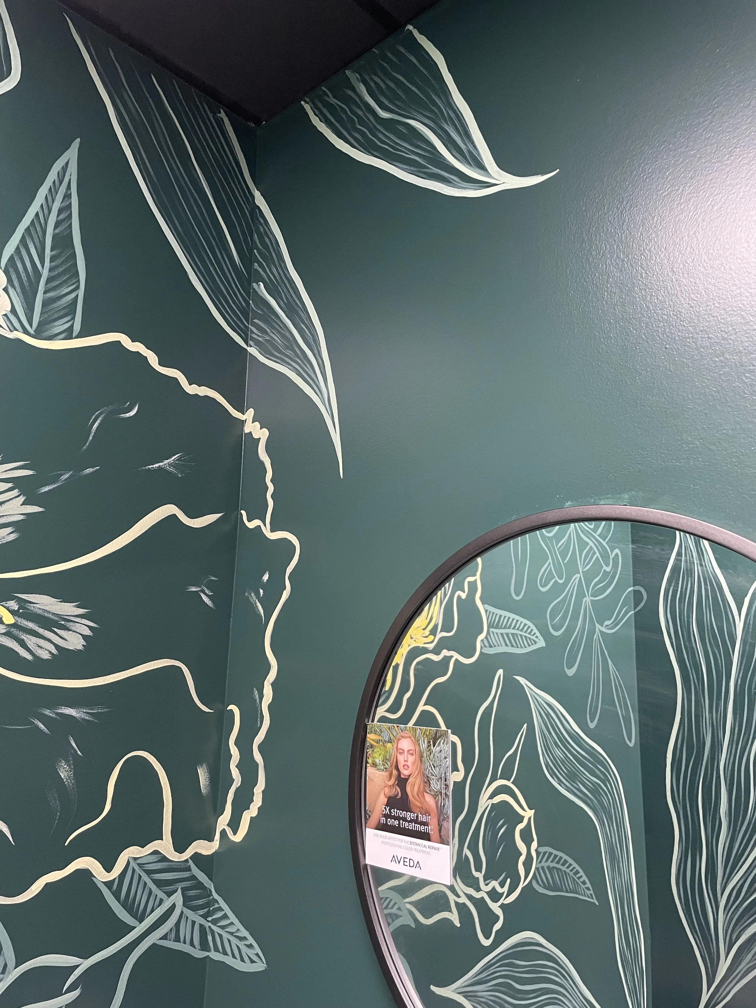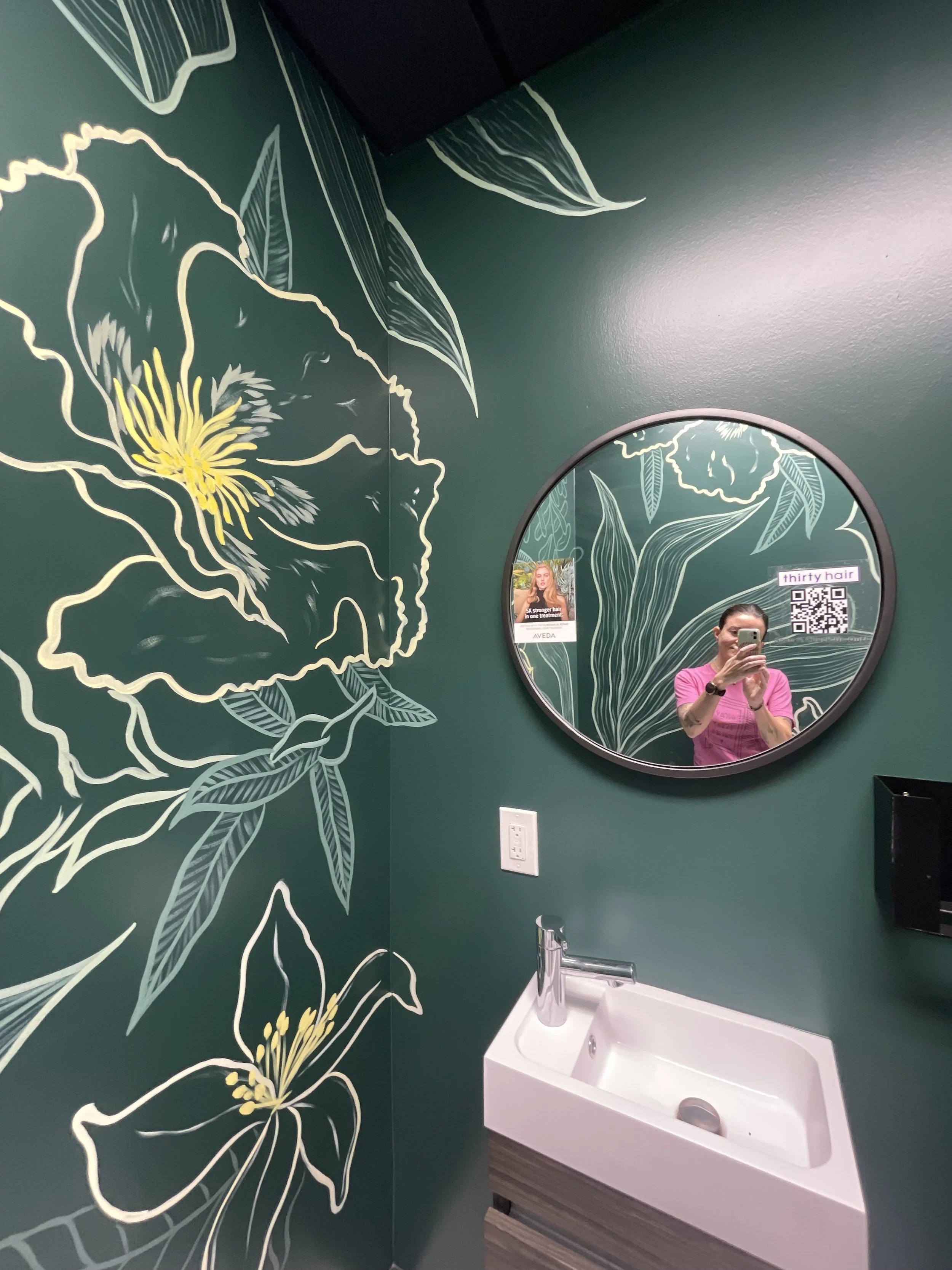 A small space with big impact. This salon bathroom mural located at Thirty Hair. in Columbia, MD transforms an everyday moment into something memorable, adding a playful, photo-worthy touch that reflects the salon’s personality and elevates the client experience. As an Aveda salon, the mural takes individual ingredients in the all-vegan products used and blows them up to an immersive and fun experience - perfect for selfies of new haircuts or a moment of respite in the middle of a work day.